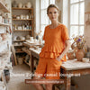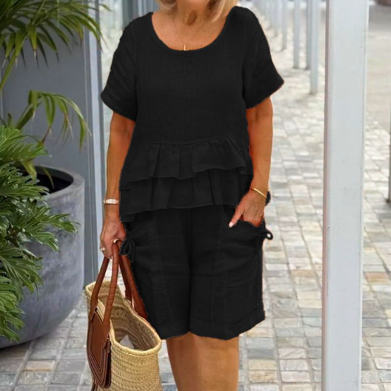 ELEGANT VOLANGKANT – Toppen har en stilren, lager på lager-volangkant som ger en modern femininitet och lekfull charm. Denna eleganta detalj lyfter den enkla designen och gör setet modernt och unikt.