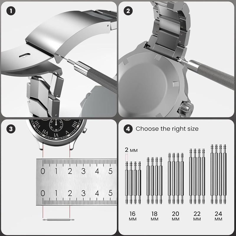 BREDD KOMPATIBILITET – Med en justerbar boettöppnare och fjäderstift i olika storlekar passar detta set för de flesta vanliga klocktyper och storlekar, vilket ger en mångsidig lösning för hela din samling.